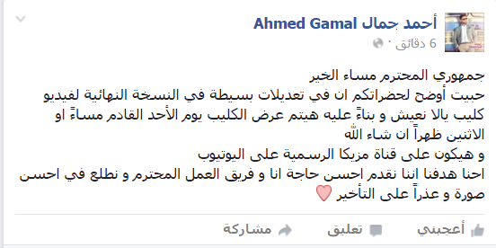 وكتب جمال عبر صفحته علي «فيس بوك»: “جمهوري المحترم مساء الخير حبيت أوضح لحضراتكم ان في تعديلات بسيطة في النسخة النهائية لفيديو كليب يالا نعيش و بناءً عليه هيتم عرض الكليب يوم الأحد القادم مساءً او الاثنين ظهراً ان شاء الله”.