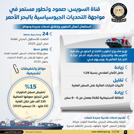 نشر المركز الإعلامي لمجلس الوزراء عددًا من الإنفوجرافات عبر منصاته على مواقع التواصل الاجتماعي، سلط من خلالها الضوء على الصمود والتطور المستمر لقناة السويس في مواجهة التحديات الجيوسياسية بالبحر الأحمر.
