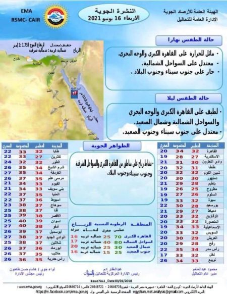 وأوضحت الهيئة أن هناك نشاط للرياح على مناطق من القاهرة الكبرى والسواحل الشرقية وجنوب سيناء