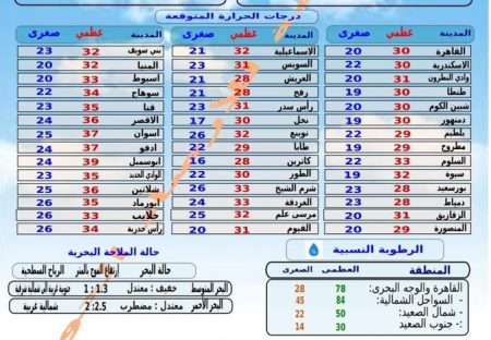 وتتراوح درجات الحرارة، على القاهرة بين 30 ـ 20 درجة، والإسكندرية بين 30 ـ 22 درجة، ومطروح بين 29 ـ 20 درجة، وسوهاج بين 34 بين 22 درجة، وقنا بين 36 بين 22 درجة، وأسوان بين 38 درجة ـ 25 درجة مئوية