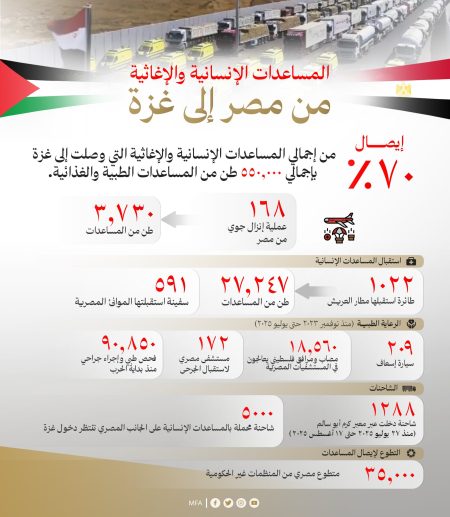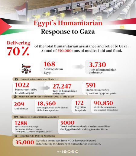 وأشار البيان إلى أن مصر نفذت 168 عملية إنزال جوي، إضافة إلى استقبال 591 سفينة محملة بالمساعدات، فيما استقبل مطار العريش الدولي أكثر من 1,022 طائرة مُنذ نوفمبر 2023 حتى يوليو 2025، محملة بآلاف الأطنان من المساعدات.