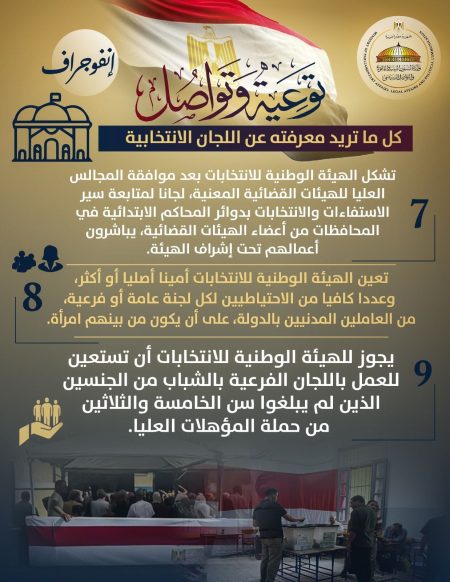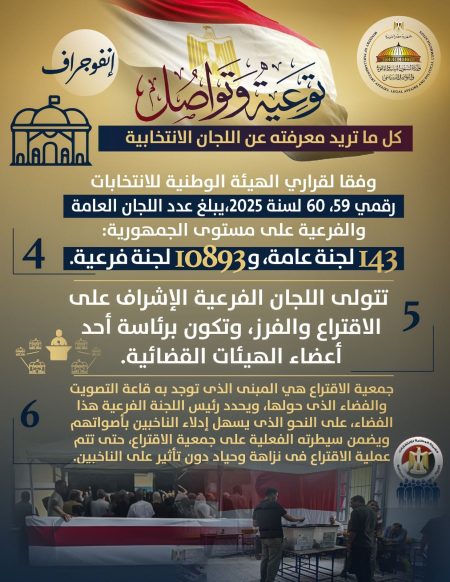 أصدرت وزارة الشؤون النيابية والقانونية بيانًا قالت فيه إنه استمرارًا لحملة توعية وتواصل التي بدأتها الوزارة بالتزامن مع انتخابات مجلس النواب، نشرت اليوم الأحد ٩ نوفمبر ٢٠٢٥، إنفوجرافات توعية تتعلق باللجان الانتخابية، وكل الأسئلة حولها، بعنوان (توعية وتواصل.. كل ما تريد معرفته عن اللجان الانتخابية.. تشكيل اللجان العامة والفرعية.. المهام والاختصاصات.. لجان المتابعة بالمحافظات.. جمعية الاقتراع).