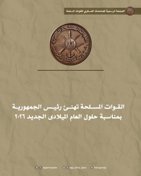 بعث الفريق أول عبد المجيد صقر القائـد العـام للقـوات المسلحـة وزيـر الدفـاع والإنتـاج الحربـى ببرقية تهنئـة للسيد الرئيس عبد الفتاح السيسي رئيس الجمهورية القائد الأعلى للقوات المسلحة بمناسبة حلول العام الميلادى الجديد 2026.
