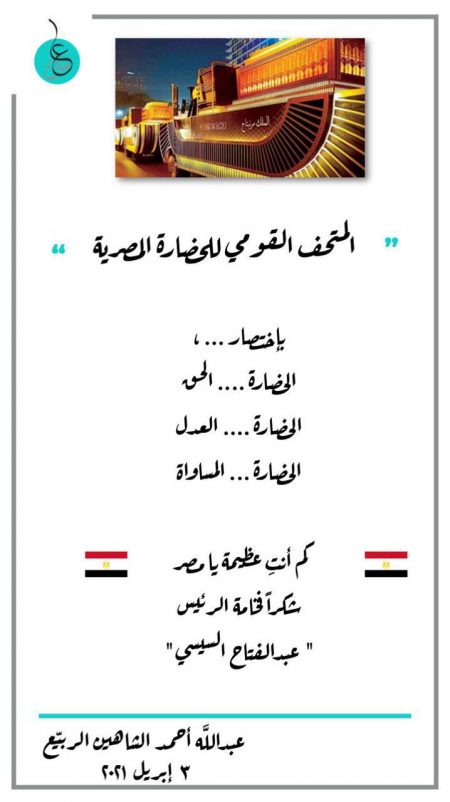 ووصف الشاهين حفل نقل المومياوات بالأسطوري، شاكراً فخامة الرئيس عبدالفتاح السيسي مجدد الحضارة المصرية ومحيي تاريخها.