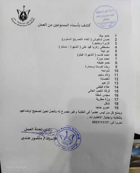 رصد رئيس لجنة العمل بنقابة الموسيقيين منصور هندى أسماء الممنوعين من الغناء، حيث أعلنت النقابة عن أسماء من ليس لديهم تصريح للعمل، وهم كالتالى: