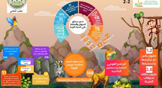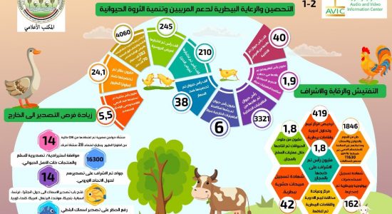 واوضح الملخص أنه تم ايضا رش 6 ملايين رأس حيوان لمكافحة الطفيليات الخارجية مجانا، كذلك 3312 رأس حيوان تم علاجها من الطفيليات الداخلية، و 1.9 مليون رأس أغنام وماعز تم علاجها في حملات التجريع السيادي لمكافحة الطفيليات مجانا، و 40 ألف رأس حيوان تم علاجها من الأمراض الإنتاحية.