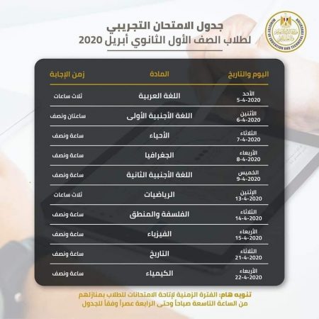 نشرت وزارة التربية والتعليم والتعليم الفني، جدول الاختبارات التجريبية للصف الأول الثانوي من ٥ ابريل حتى ٢٢ ابريل ٢٠٢٠ والساعات المحددة لأداء الاختبار في كل محافظة.