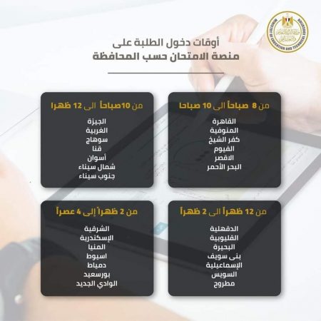 واكدت الوزاةة انه سيتم اتاحة الامتحانات للطلاب بمنازلهم وعلى التابلت في الفترة الزمنية من الساعة التاسعة صباحا وحتى الرابعة عصرا وفقا للجدول، مع العلم أنه يمكن أداء الامتحان من جهاز التابلت أو أي جهاز كمبيوتر أو محمول متصل بالإنترنت عن طريق الواي فاي أو الشريحة.