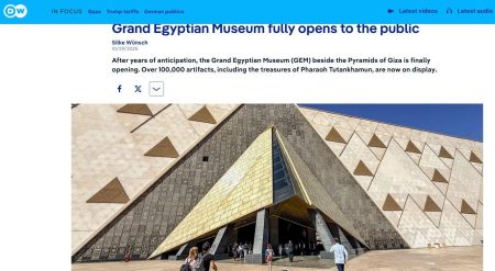 بينما قالت دويتشه فيله الألمانية إنه بعد سنوات من الترقب سيتم افتتاح المتحف المصري الكبير والذي سيعرض كنوز الملك توت غنخ أمون.