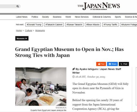 صحيفة يابان نيوز ألقت الضوء بشكل كبير على التعاون المصري الياباني في مشروع المتحف المصري الكبير من خلال وكالة الجايكا.