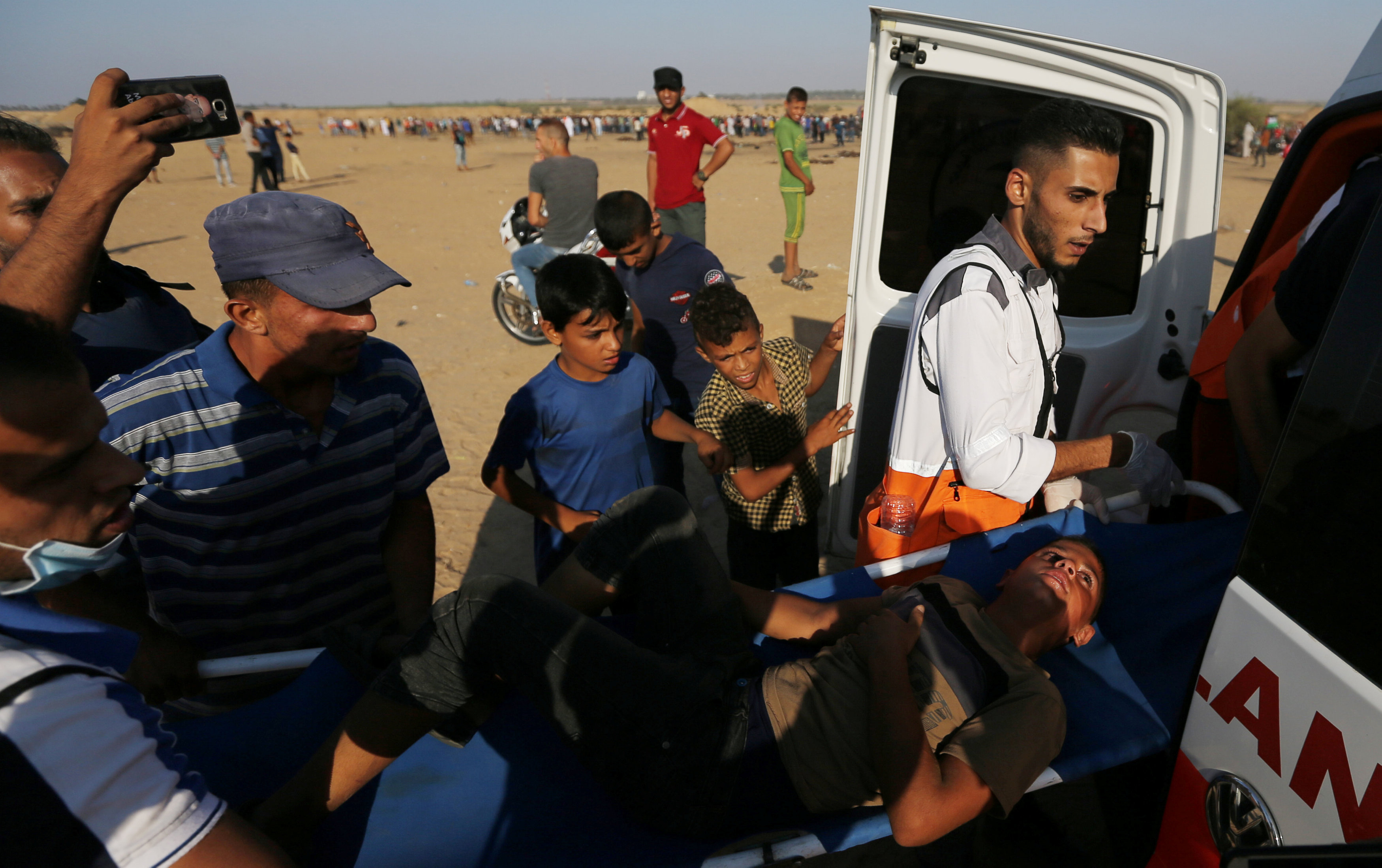 wounded Palestinian boy is evacuated during clashes with Israeli troops at a protest at the border fence between Israel and Gaza, in the southern Gaza Strip