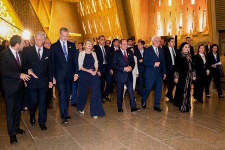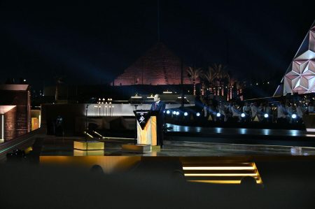 وصرح المُتحدث الرسمي باِسم رئاسة الجمهورية بأن السيد الرئيس حرص على استقبال السادة رؤساء الوفود من أصحاب الجلالة والفخامة والسمو والسعادة المشاركين في الاحتفالية، التي بدأت بعرضٍ فني بعنوان “العالم يعزف لحنًا واحدًا”، أعقبه عرض “الليزر والدرونز”، والذي شرح نظرية “حزام اوريون”، وعلاقة بناء المتحف المصري الكبير بالأهرامات، ليأتي من بعده عرض فني بعنوان “رحلة سلام في أرض السلام”، تخلله مشهد فني عن إبداع المصريين في البناء بداية من بناء هرم زوسر حتى البناء في العصر الحديث، ليستمع الحضور لأغنية قبطية، وإنشاد صوفي، ثم عرض آخر بالدرونز يظهر عبارة “الحضارات تزدهر وقت السلام”.