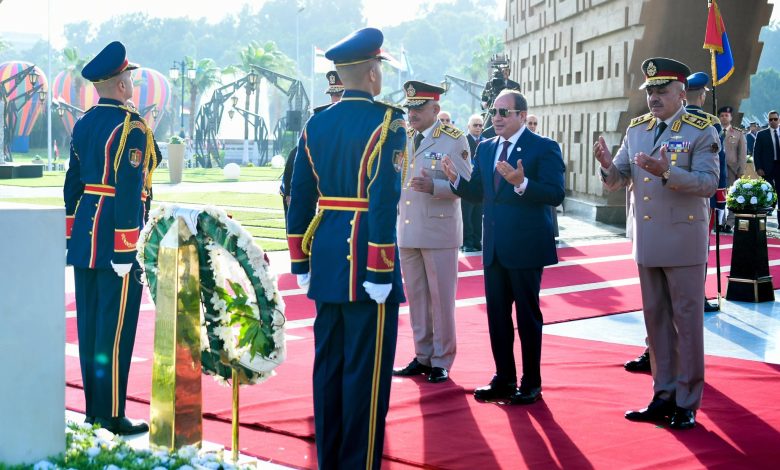 وصرّح المتحدث الرسمي باِسم رئاسة الجمهورية بأن السيد الرئيس وضع إكليل الزهور على قبر الجندي المجهول، فيما عزفت الموسيقى العسكرية “سلام الشهيد” تكريمًا لأرواح شهداء مصر الأبرار، وتجسيدًا لمعاني الوفاء والعرفان لتضحياتهم الخالدة.
