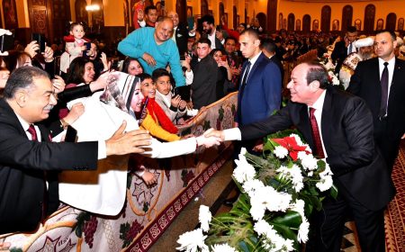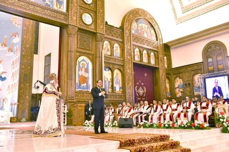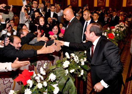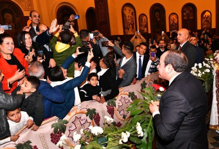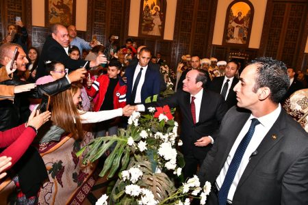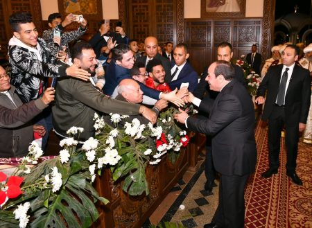 وحرص الرئيس السيسي على مصافحة المتواجدين بالكاتدرائية، حيث هنأ الرئيس أقباط مصر قائلا لهم: “احنا كلنا واحد، وكل عام وأنتم طيبين وعيد سعيد عليكم وعلينا جميعا يارب سنة خير ومحبة علينا كلنا مش بس في مصر في العالم كله والدنيا كلها”.