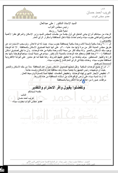 وتسائل حسان في بيانه “هل من العدل أن يقوم الموظف بدفع الأقساط المرتفعة للبنك بزيادة 7% كل عام مع العلم أن مدينة طور سيناء مدينة ليست سياحية والمواطنين بها لا يمتلكون سوى مرتباتهم؟”، على حد قولة.